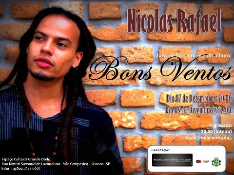 Em lançamento do seu primeiro disco, o cantor e compositor paulistano Nicolas Rafael traz para cena o repertório de seu álbum "Bons Ventos" dominando em suas canções o ritimo alegre do samba, com pitadas de bossa nova e pop rock, estabelecendo um encontro de cultura e sonoridade atraves de sua perfomance.O disco foi produzido por Jefferson Perovani e Rafael Cardoso do Estúdio One Music que trabalharam forte nas canções e na sonoridade desse álbum.O Público presenciou esse trabalho num show intimista realizado no Teatro Grande Otélo em Osasco.